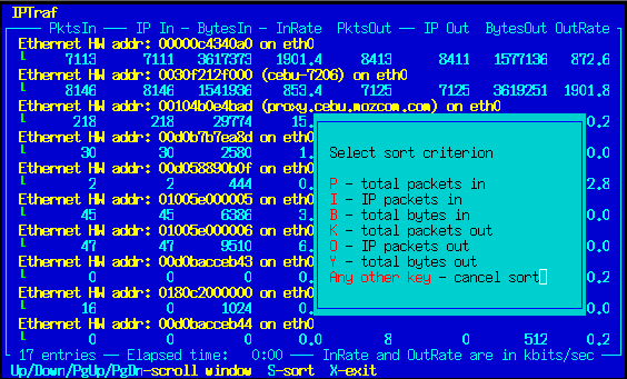 Press S to sort the entries. A box will pop up and display the keys you can press to select the field by which the entries will be sorted. Press P to sort by total incoming packets, I to sort by incoming IP packets, B to sort by total incoming bytes, K to sort by total outgoing packets, O to sort by outgoing IP packets, and Y to sort by total outgoing bytes. Pressing any other key cancels the sort.